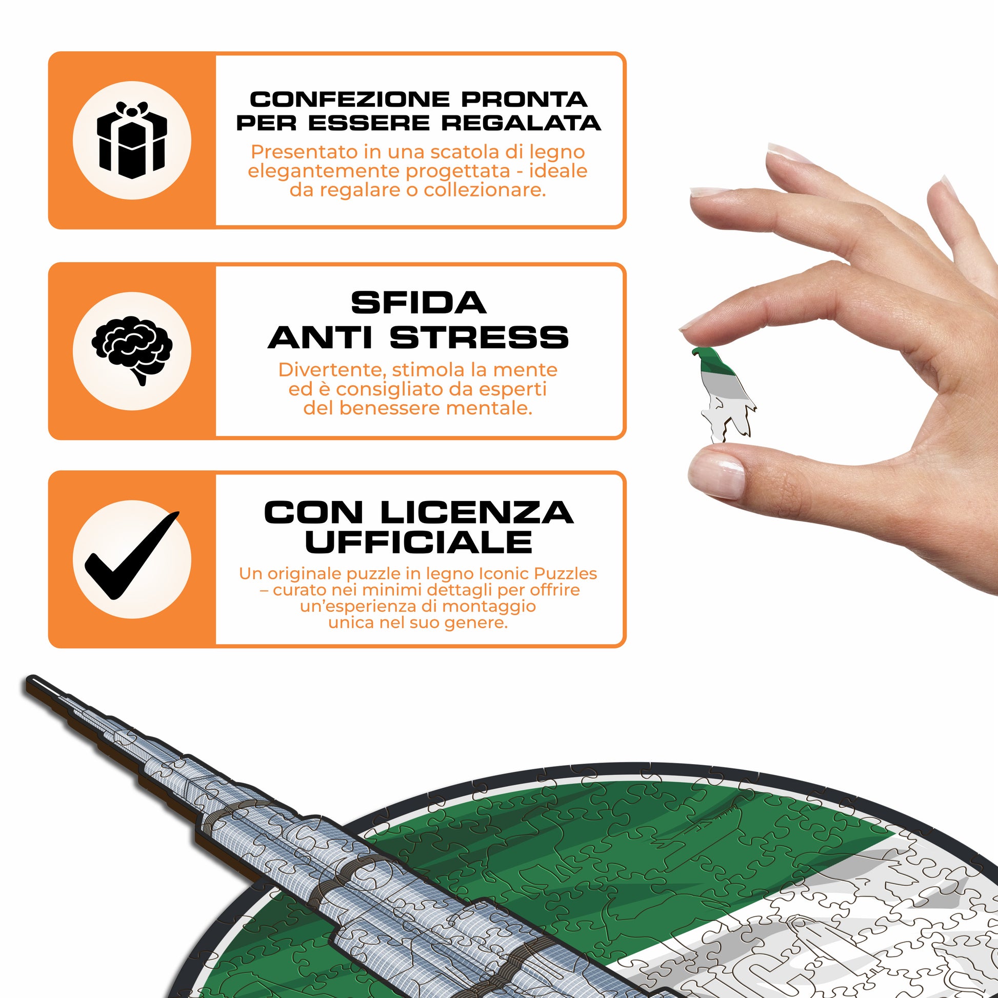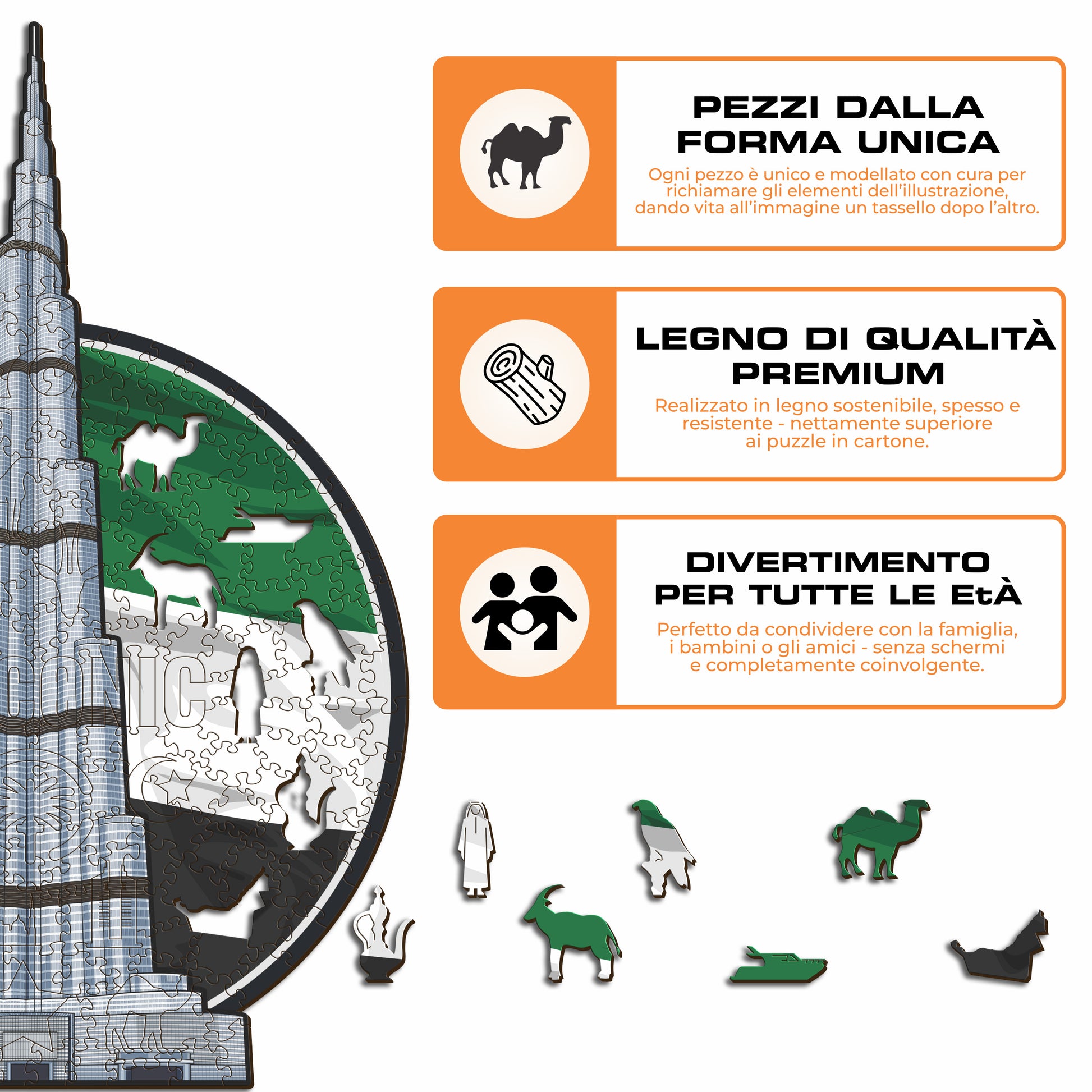 ✓ Ogni pezzo del puzzle ha una forma unica che raffigura elementi legati agli Emirati Arabi.