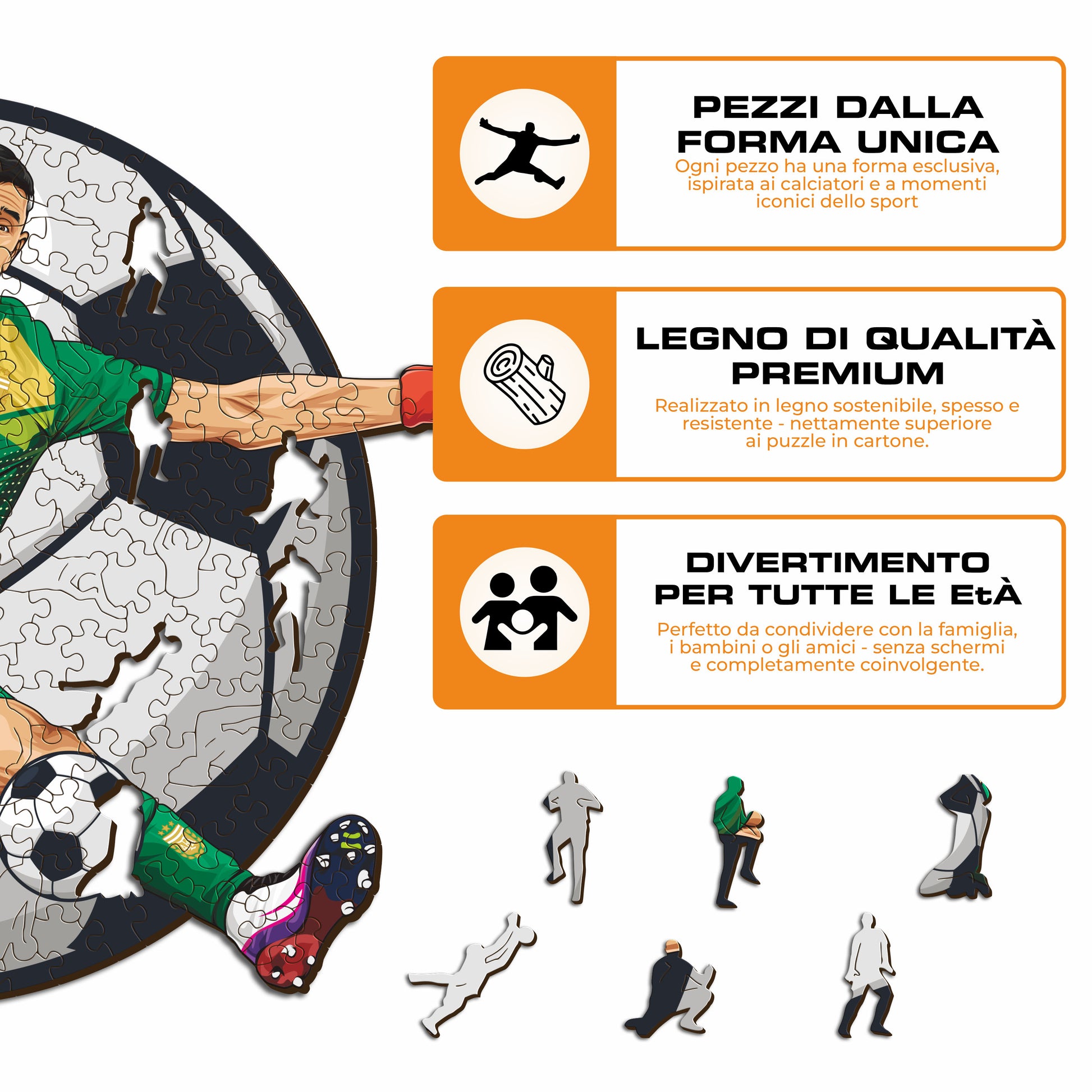 ✓ Ogni pezzo del puzzle ha una forma unica che raffigura elementi legati al calcio e gesta iconiche dei giocatori.