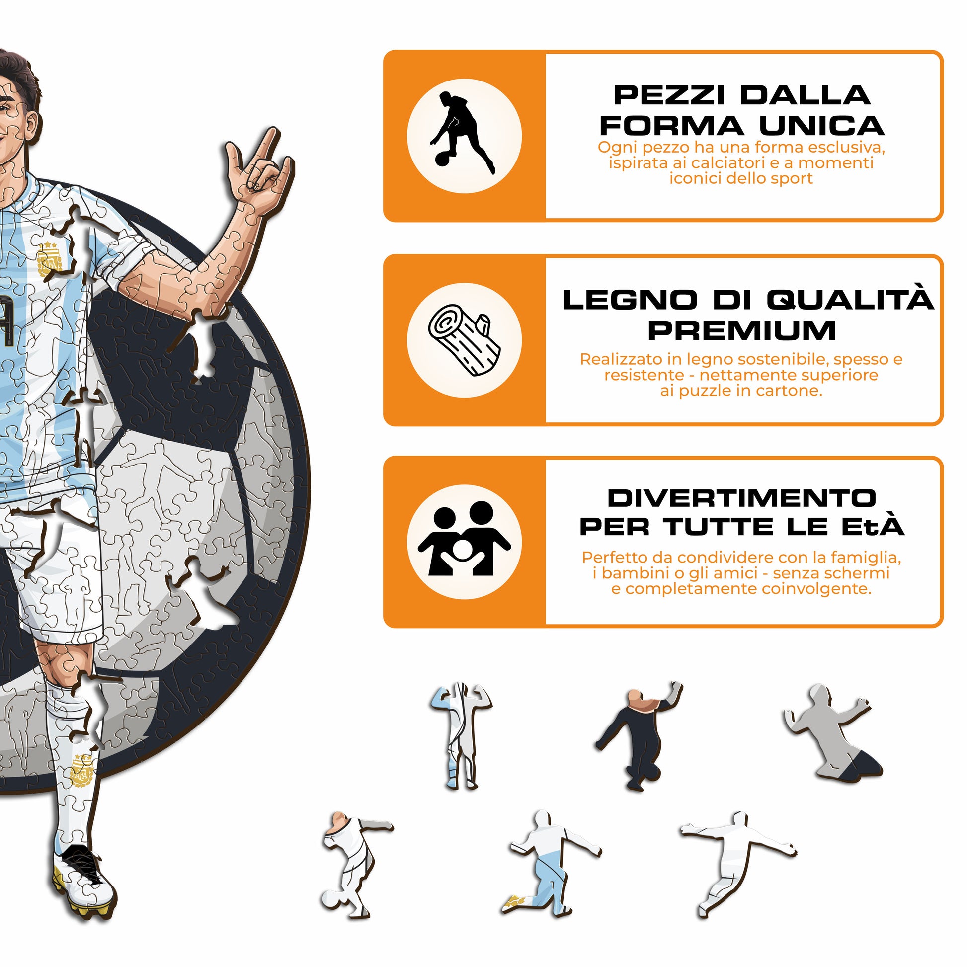 ✓ Ogni pezzo del puzzle ha una forma unica che raffigura elementi legati al calcio e gesta iconiche dei giocatori.