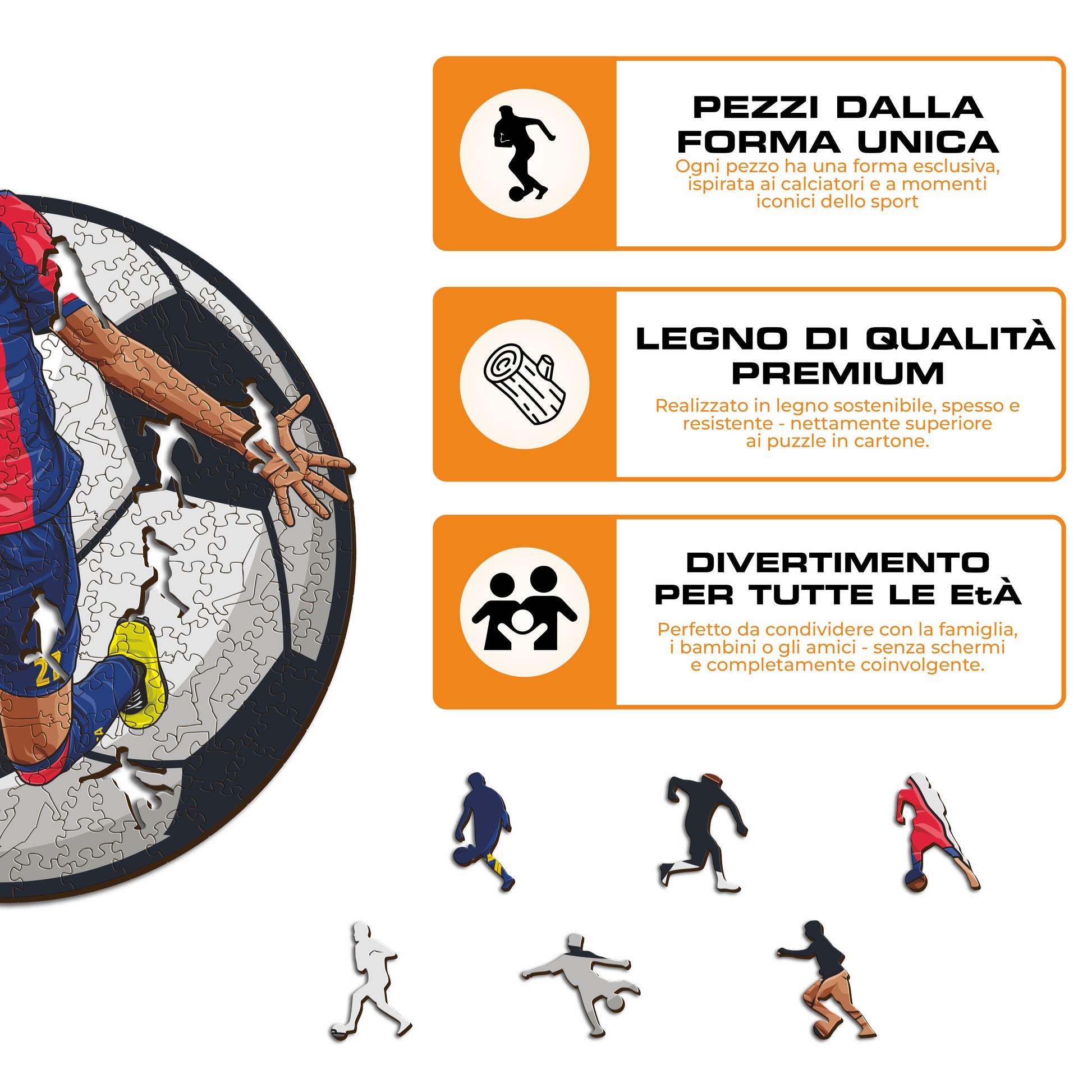 ✓ Ogni pezzo del puzzle ha una forma unica che raffigura elementi legati al calcio e gesta iconiche dei giocatori.